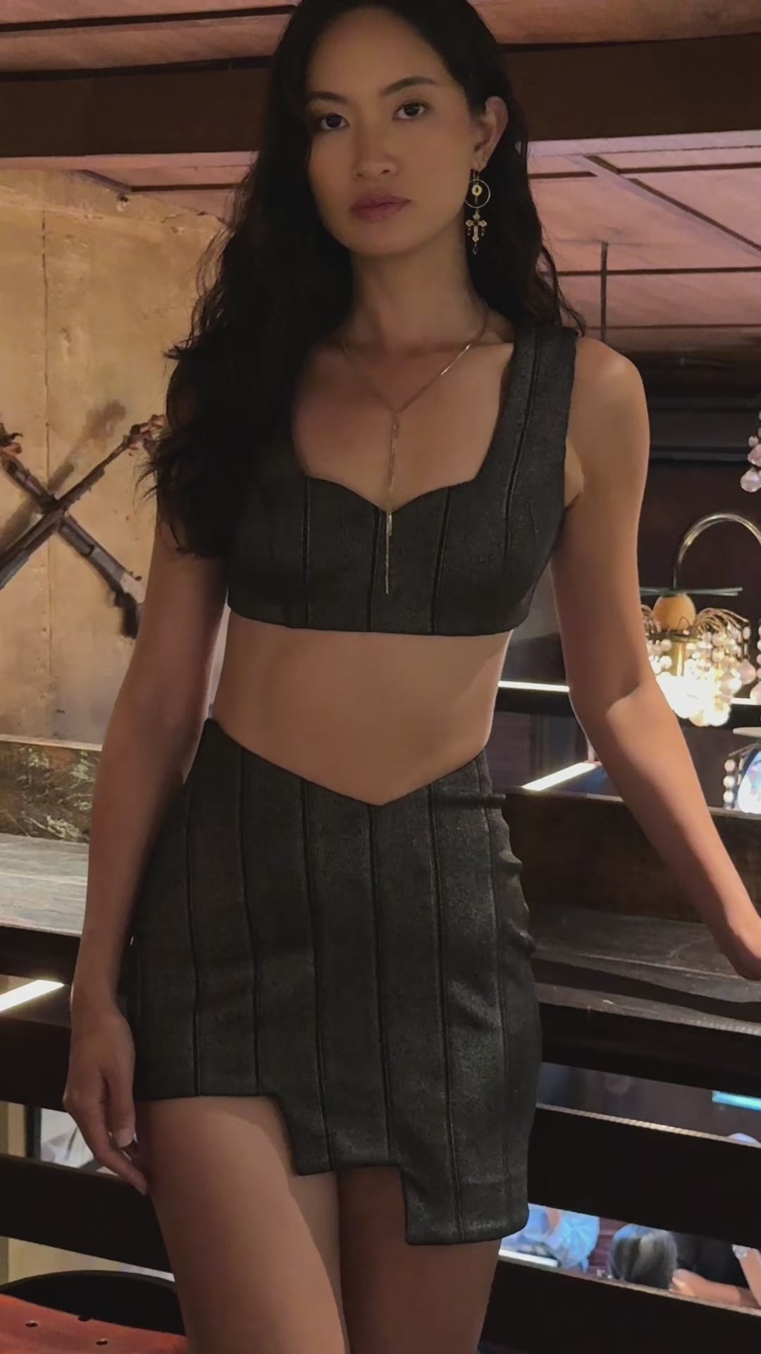 Style this bodycon evening set with metallic stilettos, a statement clutch, and shimmering earrings. Let your hair down, add a glowing highlight, and you’re ready to command the night. This matching mini skirt set is made for women who walk like the world is their runway.